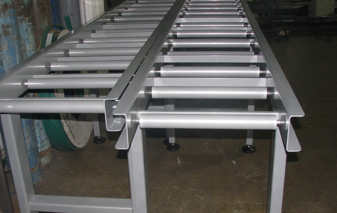 Конвейер собирается из секций, состоящих из опирающейся на стойки рамы и укрепленных на ней роликов. Для изменения угла наклона рольганга стойки выполняют выдвижными. В большинстве случаев ролики имеют цилиндрическую форму и вращаются на подшипниках на неподвижных осях. При транспортировке грузов цилиндрической формы (к примеру, труб, круглого проката и т.д.) применяют коноидальные либо парные наклонные ролики.